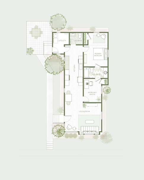 Shotgun houses aren’t particularly common in this area, so here, it feels like an appropriate blend of efficiency on the lot with a hint of craftsman character. I’ll call this one ‘compact craftsman.’ Historically, shotgun homes were common in the South and a result of narrow lots. They’re only a single-story, one room wide and two to three rooms deep without hallways.